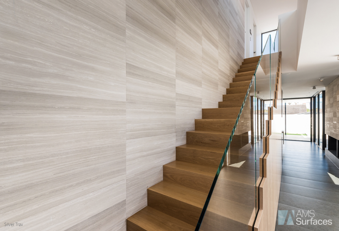 Vein cut silver travertine tiles-the natural colour variation creates a distinct and unique feature for this internal entrance hall wall.